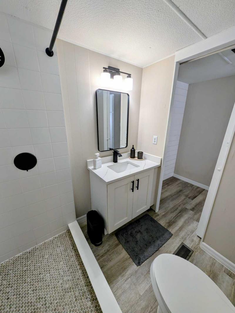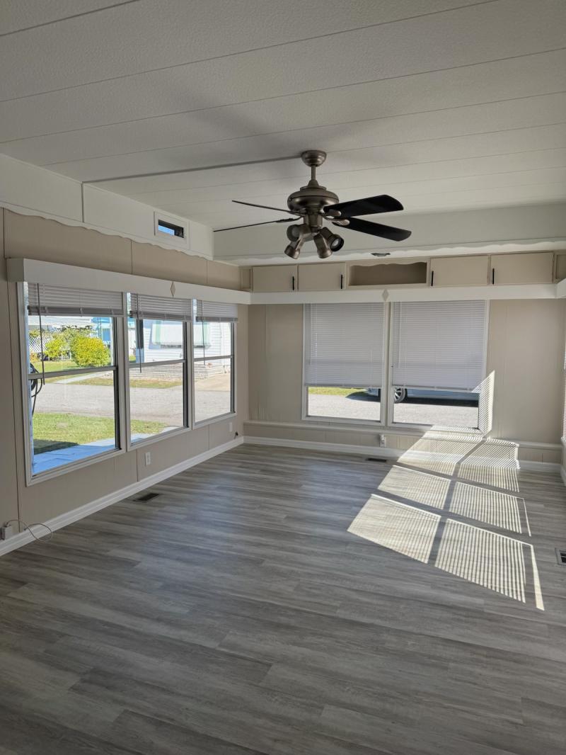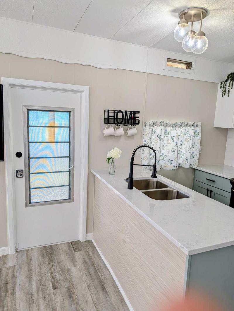 GREAT year-round or seasonal getaway. This larger lot home is within walking distance to Bradenton services, shopping, and dining. This home is very bright, clean and ready to move in. It comes unfurnished. New luxury vinyl flooring throughout the entire home. The beautiful remodeled bathroom has a large ceramic tile walk-in shower. This spacious home has large storage areas and high ceilings. There is a washer dryer hook up in the laundry adjacent to the shed. The kitchen has new quartz countertops with updated appliances. The electric panel is updated. Current lot rent is $649.00 and conveniently includes part of the water bill.