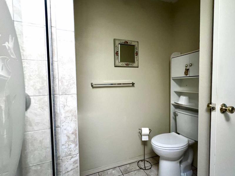 -The owners bedroom suite is large enough for King Sized furnishings plus a large walk-in closet. The En-Suite bath has been updated with a copper statement sink that pairs with the large ceramic walk-in shower plus a skylight. The commode is comfort height in its own private nook.