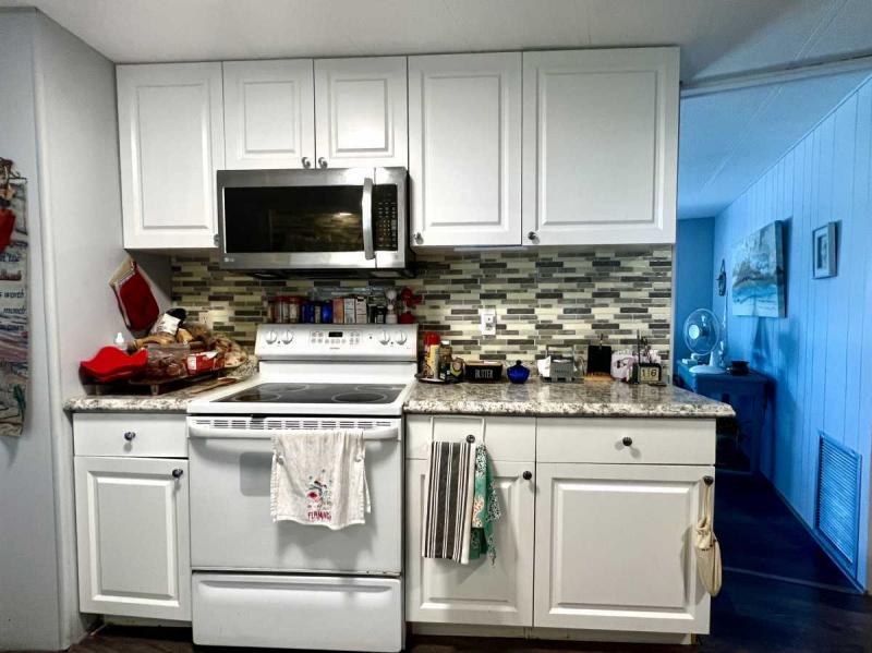 ~KITCHEN/DINING ROOM: Updated kitchen, white cabinetry, deep standard sink plus appliances; dishwasher, over the range microwave, range and newer two door refrigerator. The attached dining area has a custom updated built-in hutch that allows for both storage/display; perfect for a coffee or adult beverage bar.