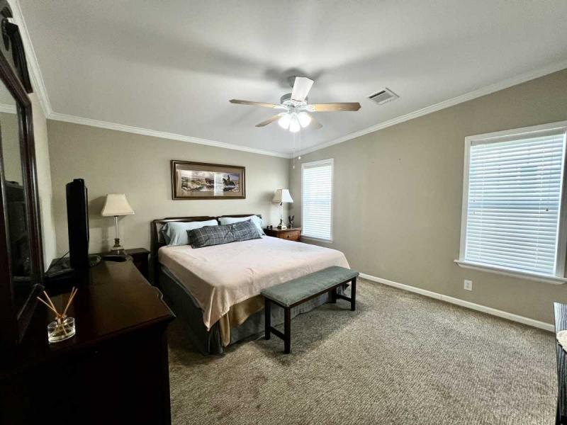 -OWNERS BEDROOM SUITE ~ Features ensuite bath, walk-in wardrobe closet, double sink vanity. Water closet has a large step-in shower + seat with sliding glass doors and commode. The owners bedroom suite is large enough for king size furniture.