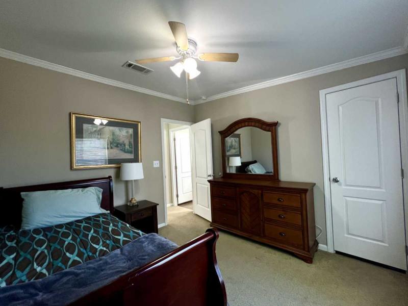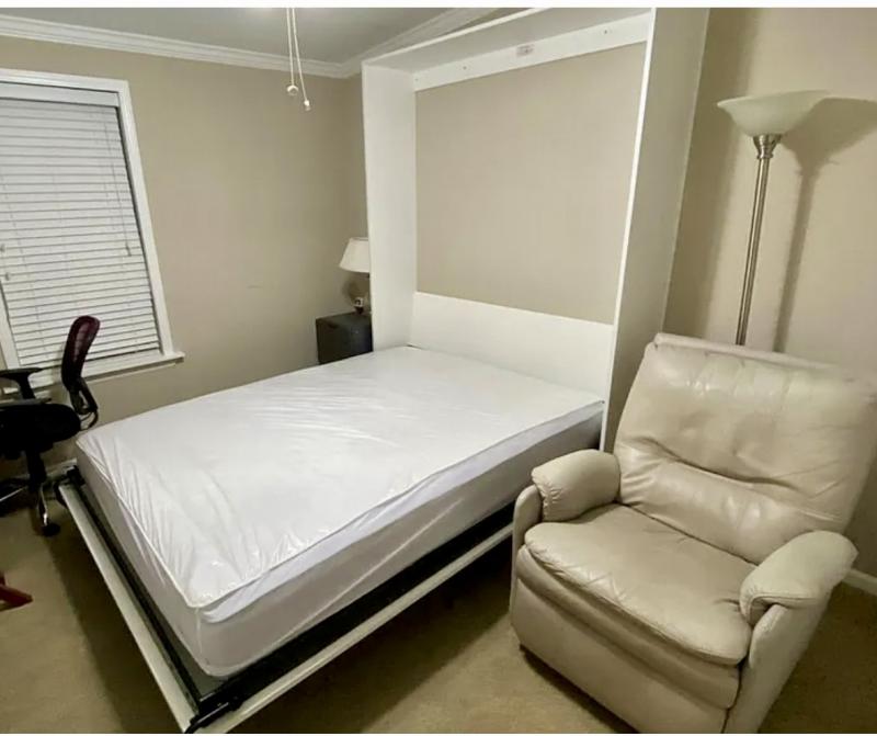 Both guest bedrooms are full sized rooms. French doors open into to the one that is currently used as a home office that has a Murphy Bed (custom coastal mural on front) for EZ bedroom conversion! A full bath just a few steps away with a step-in shower for easy access from living areas and guest bedrooms.