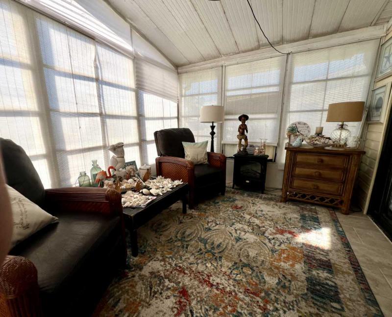 ~FLORIDA ROOM/FLEX: Large 10 X 14 with ceramic floors; flows from living room through sliding glass doors. Can be flexibly used as extra bedroom, office, den or hobby room. Watertight room with new screens in 2025. Step out the private entrance door to an extra seating area.