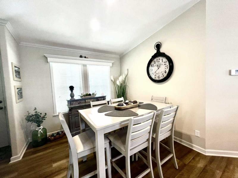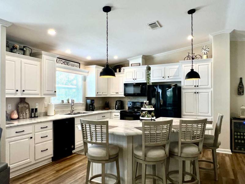 ~KITCHEN/DINING: The chef in your home will love the prep space, stainless steel sink, island seating plus pendant lights. Highly desired white cabinetry and contrasting, matching appliances. Separate dining area for extra guests
