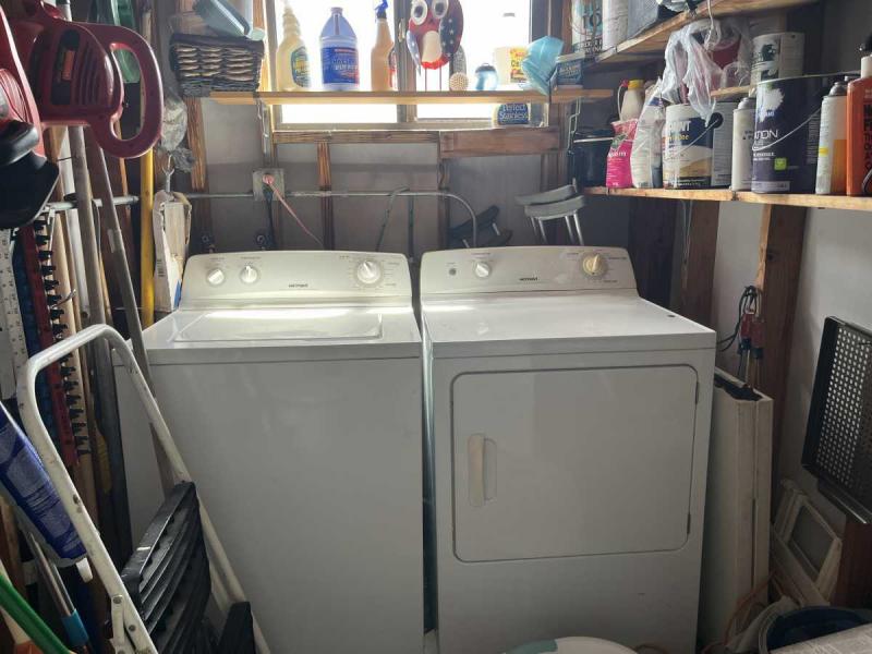 The shed is located behind the lanai where the washer and dryer are located and shelving for storage.
