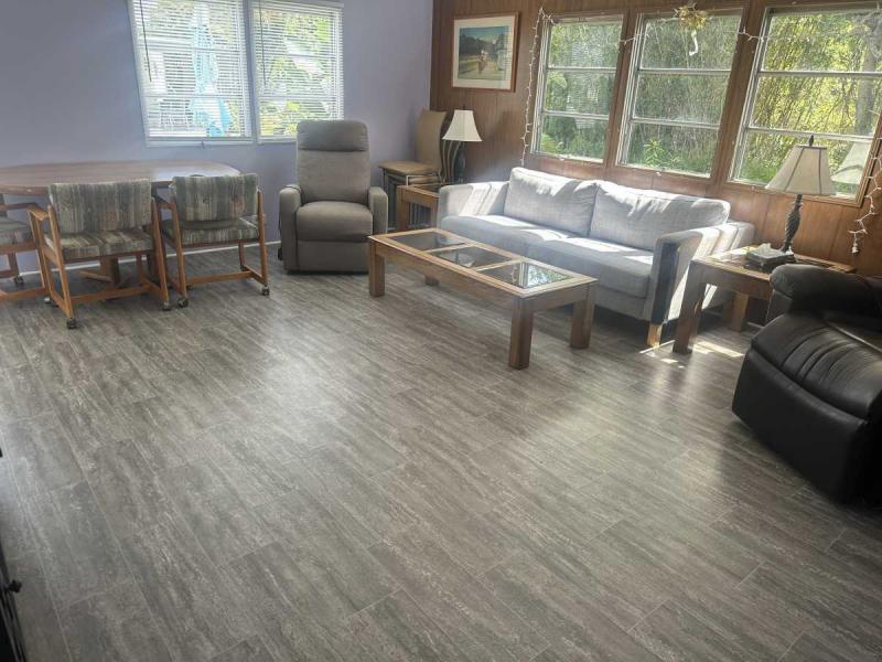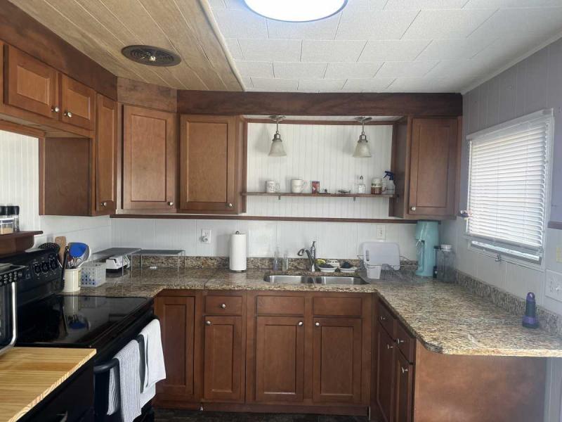 The large kitchen has lots of updated cabinets, updated appliances and countertops. . The dining room is open to the large living area and kitchen. This home comes completely furnished and many rooms have new laminate flooring.