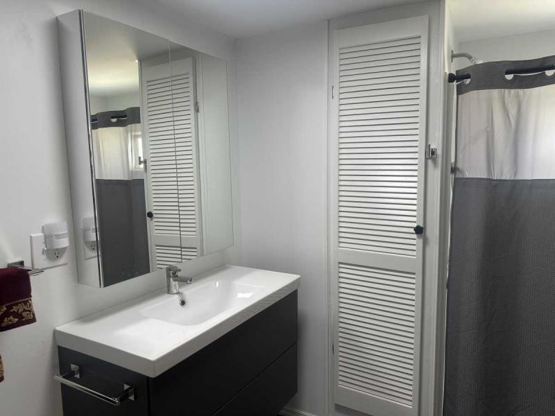 The hall bath has vinyl flooring, updated single sink vanity and updated walk in shower. .