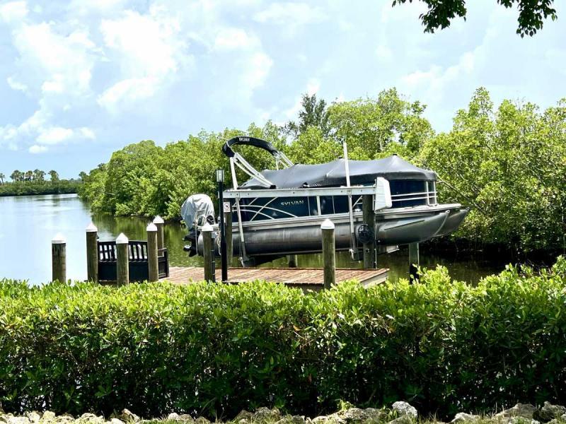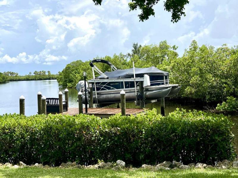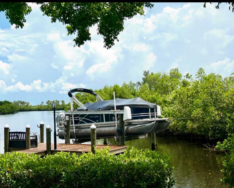 Canal WaterFront home on the Manatee River; boat dock and a quality IMM Alumavator vertical boat davit/lift rated at 10,000 lbs! A standard pontoon 27 ft boat is stored on this lift for size reference (not included).