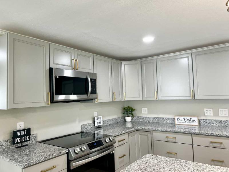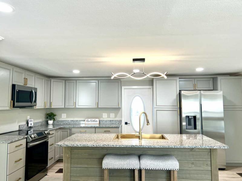 ~KITCHEN: ALL NEW! Cabinet packed kitchen with an island for extra prep space or casual dining area. There are two large pantries. You will appreciate the trendy lighting, granite countertops and a large farm sink in luxurious gold.