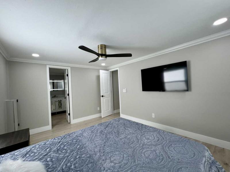 +OWNERS BEDROOM SUITE: XLarge room that features all new laminate flooring plus new ceiling fan. ALL NEW en-suite bath; over-sized ceramic walk in shower/trendy glass doors, large 8 ft closet and new floating hard surface under-mount vanity plus fog free, lighted mirror make this a true oasis!