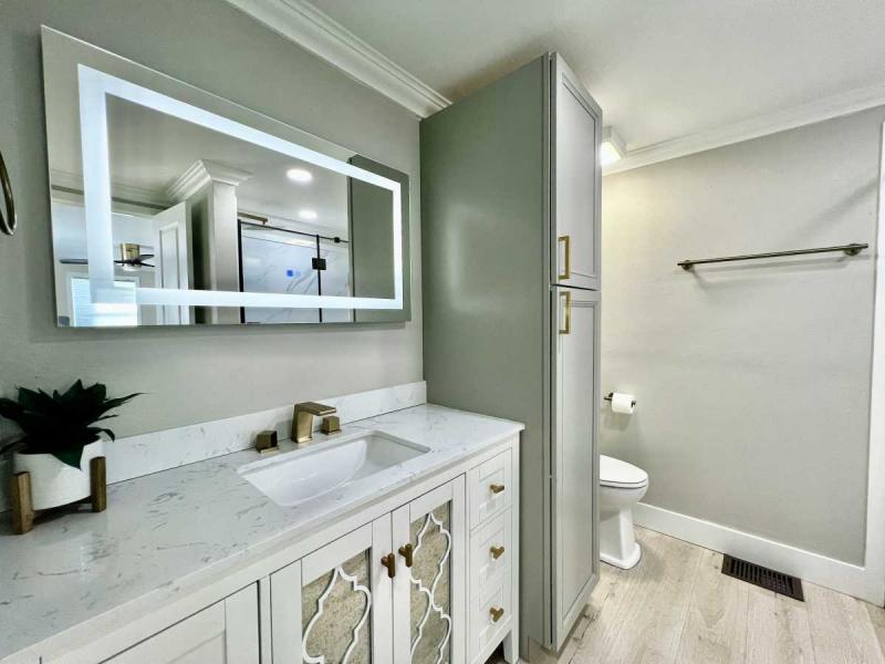 + GUEST BEDROOM/BATH: New laminate flooring and a large reach-in closet The Guest/Hall bath is just steps away with a new over-sized ceramic shower/trendy glass doors, lighting and a new floating hard surface under-mount sink vanity plus fog free, lighted mirror!