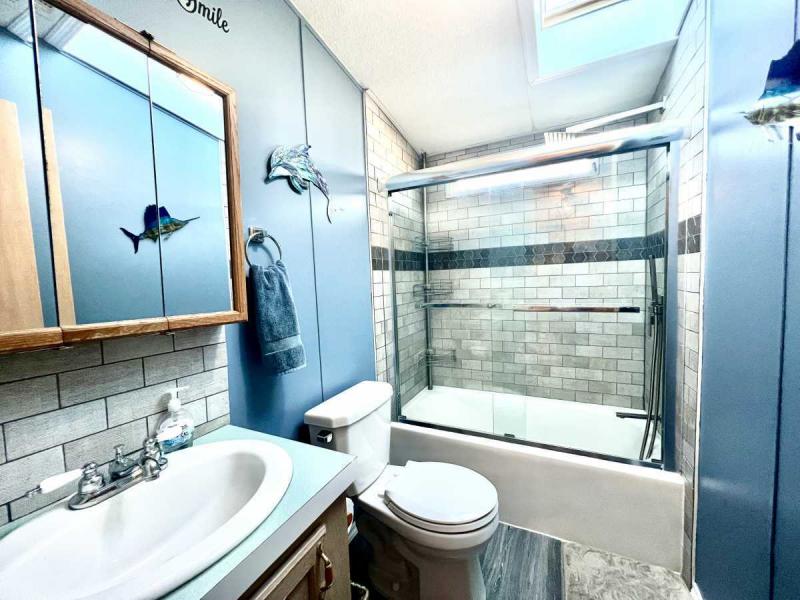 -GUEST BEDROOM/GUEST BATH: The guest bedroom is generous in size and can accommodate queen sized furniture. A full bath is just a few steps away with a new tile shower/tub combo and skylight for easy access from living areas and guest bedroom.