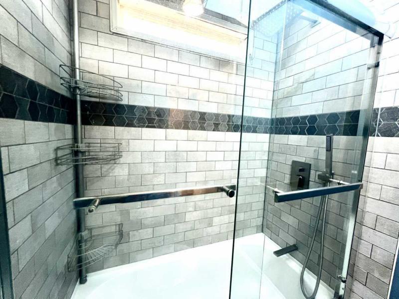 ~REMODELED HALL BATH 2024: New tile shower with rain style shower head and glass doors