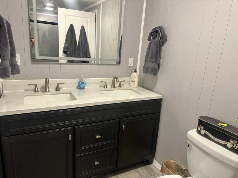 The large beautiful kitchen is open to the dining and living area. The kitchen has new cabinets, beautiful Island with a cooktop and quartz countertops. The kitchen also has new appliances and extra storage. The dining room has custom cabinets and is open to the living area. The large living room is spacious, has a ceiling fan. New laminate flooring throughout the home.